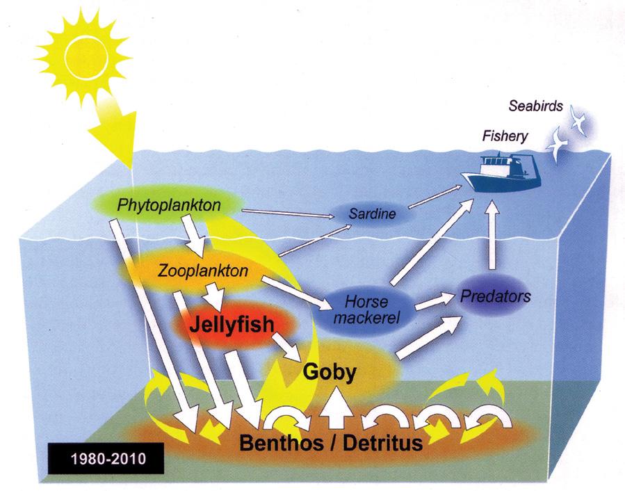 Roux J-P, et al. (2013). Jellyfication of marine ecosystems as a likely consequence of overfishing small pelagic fishes: Lessons from the Benguela. Bulletin of Marine Science 89(1): 249-284.