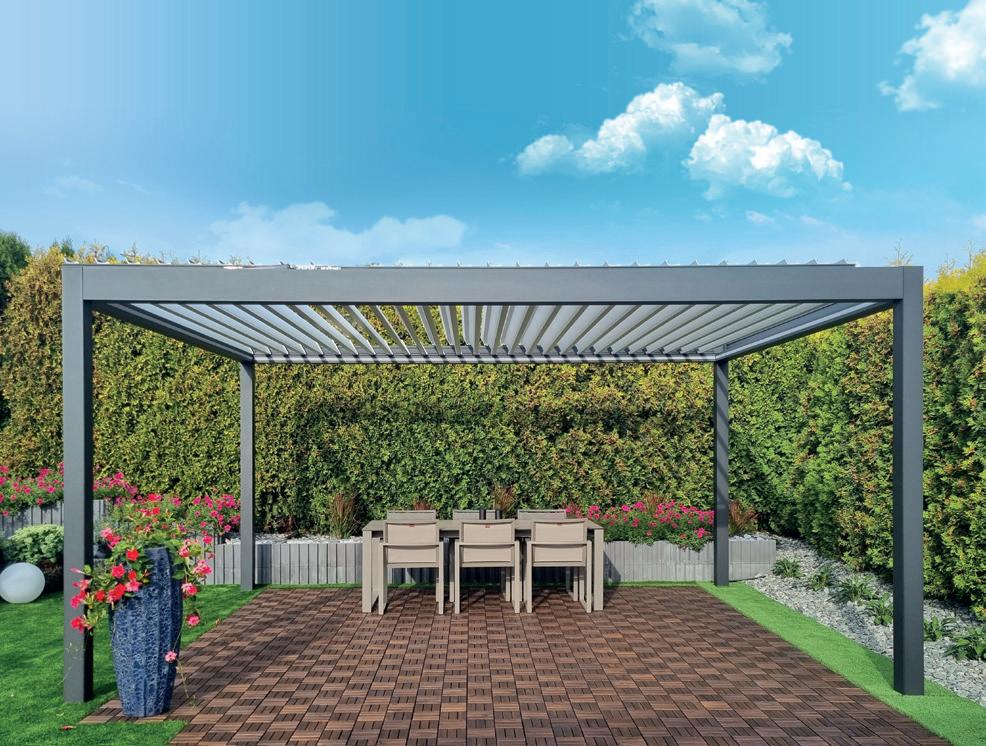 Pergola bioklimatyczna NUUN ECO to zadaszenie tarasu składające się z automatycznie obracanych lameli (poruszanych dzięki wbudowanemu napędowi elektrycznemu), zapewniających naturalną cyrkulację powietrza, jak również ochronę przed słońcem i deszczem. Otwierany dach odsłoni tyle nieba, ile potrzebujemy w danym momencie. System jest w pełni zautomatyzowany – możliwość sterowania pilotem, telefonem lub podłączenie systemu sterowania pergolą do centrali sterowania automatyki domowej zapewni komfort i wygodę użytkowania.