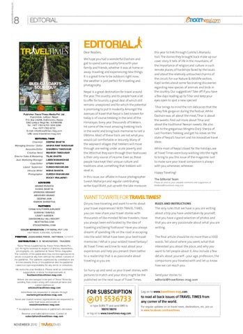 Publisher: Travel Times Media Pvt. Ltd. Kupondole, Lalitpur, Nepal P.O. Box 24206, Kathmandu, Nepal DAO Lalitpur Regd No : 63/065/66 Tel.: +977 1 553 6733 /209 3290 Fax: +977 1 553 6733 E-mail: info@traveltimes-mag.com URL: www.traveltimes-mag.com editorial team Chairman Deepak Bhatta Managing Director / Editor aasha Ram Tandukar Associate Editor Shambhu Tandukar Creative Head Mahesh Tandukar Director Sales & Marketing Tilak Khatri Asst. Marketing Manager LABIN MANANDHAR Copy Editor Utsav Shakya Layout Supervisor Suman Maharjan Inhouse Writer NISHA SHAKYA Photographer Suresh Maharjan rOCKY PRAJAPATI Advisors anand rungta Sushil Bhatta Upendra Hirawat Abhishek Anand Deepak Jain Ramon Shrestha Partners China Southern Airlines Gorkha Travels Craft Garden Dakshinkali Hill Resort nextyatra.com eticketnepal.com Color Separation: CTP Nepal Pvt. Ltd Hattiban, 5250466, 5250468 Printing: Jagadamba Press, Hattiban, 5250017 distribution: R. B. Newspapers - traders Travel Times is published by Travel Times Media Pvt. Ltd. All rights reserved in respect of articles, illustrations, photographs, etc. published in Travel Times magazine. The contents of this publication may not be reproduced in whole or in part in any form without the written consent of the publisher. The opinions expressed by contributors are not necessarily those of the publisher and the publisher cannot accept responsibility for any errors or omissions. We welcome your feedback. Please send us comments, suggestions or ideas for improvements at feedback@traveltimes-mag.com Writers are encouraged to be part of Travel Times by sending their stories along with relevant pictures and contact address at articles@traveltimes-mag.com