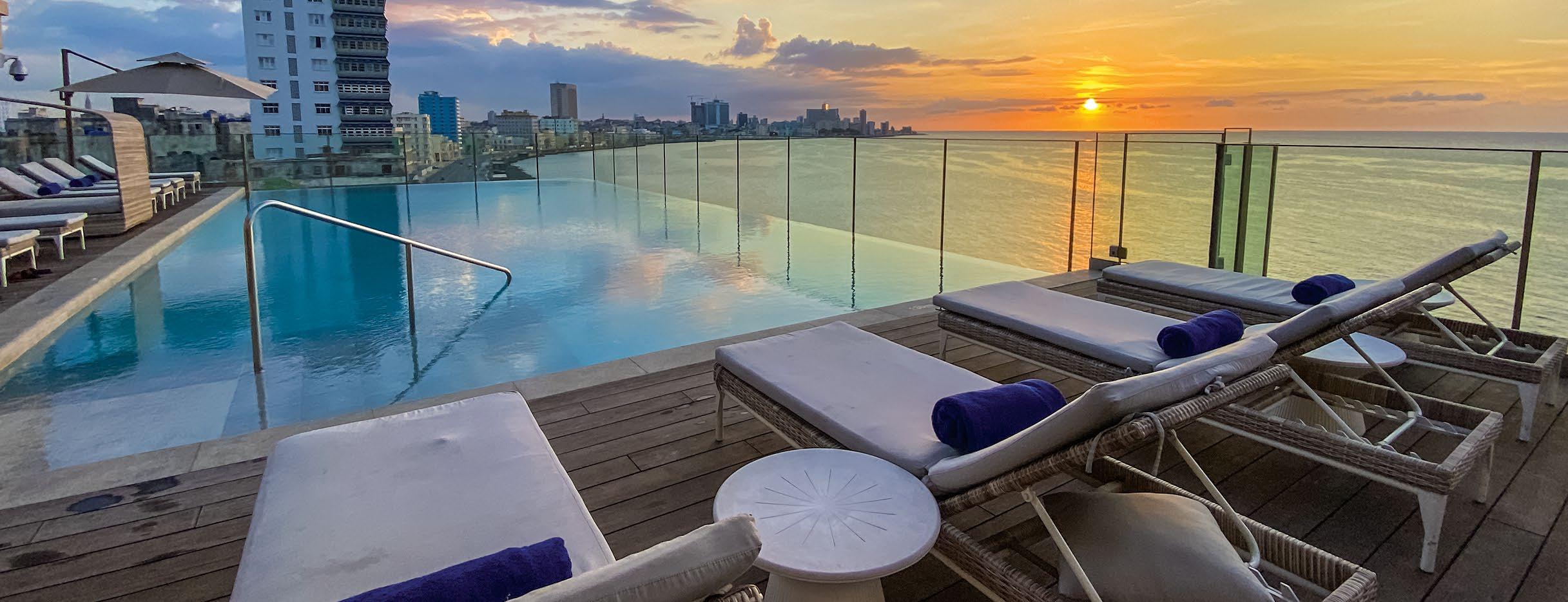 propose un spa, une salle de sport, une piscine à débordement et une sélection de restaurants élégants et variés, dont un buffet et un restaurant à la carte. Il dispose également de trois bars, dont un restaurant-bar au neuvième étage avec terrasse extérieure offrant une vue panoramique imprenable. Ses deux salles pour événements et réunions : Malecón et Prado, sont parfaites pour les présentations, les conférences et les dîners privés. Le Café Lounge est un endroit charmant conçu pour savourer des pâtisseries délicieuses et se laisser séduire par la sensualité des chocolats artisanaux et du café cubain. L’arôme authentique de Cuba reste dans les souvenirs des visiteurs.