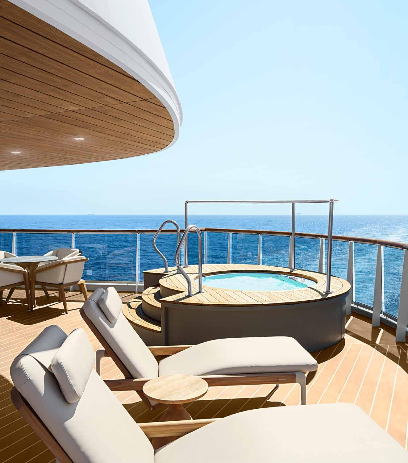 — Panoramic ocean-front terrace covering the full ship’s width, with a private spacious whirlpool, day beds, a dining table, a scenic lounge area, shower