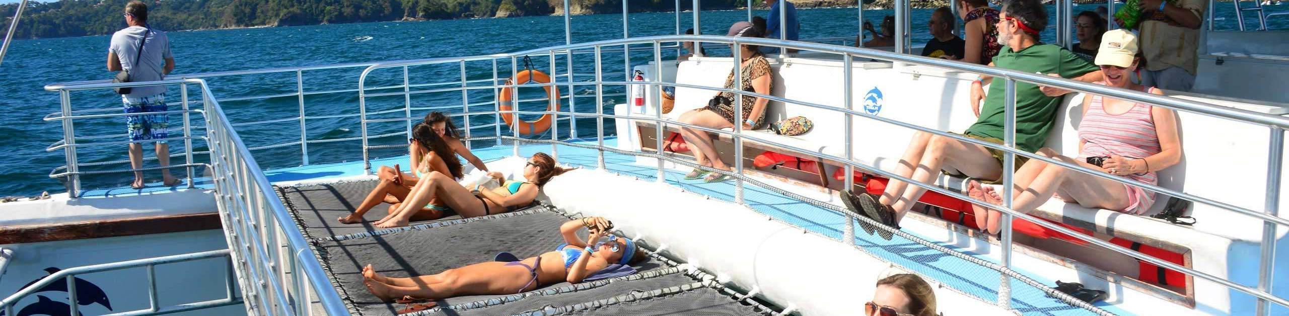 Afternoon-SunsetCatamaranAdventurefromPezVelaMarina:After your hike, travel to Marina Pez Vela in Quepos for an unforgettable ocean adventure aboard a spacious catamaran. Set sail in the late afternoon, cruising along the stunning Pacific coastline with panoramic views, tropical islands, and the lush backdrop of Manuel Antonio National Park.