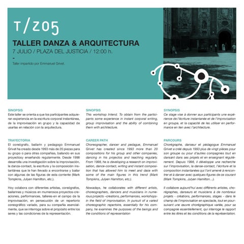 T/z05 TALLER DANZA & ARQUITECTURA 7 JULIO / PLAZA DEL JUSTICIA / 12:00 h. Taller impartido por Emmanuel Grivet.