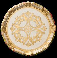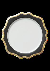 Available in Charger, Dinner, Salad and Bread Plate Elegant Fine China with delicate raised detailing on rim with a fine gold-lined edge