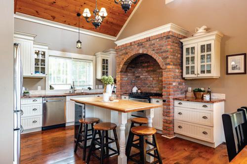 The cozy living room features a natural gas fireplace surrounded by a charming brick facade, creating an inviting atmosphere. The brick accents seamlessly extend into the custom kitchen, framing the gas range and oven.