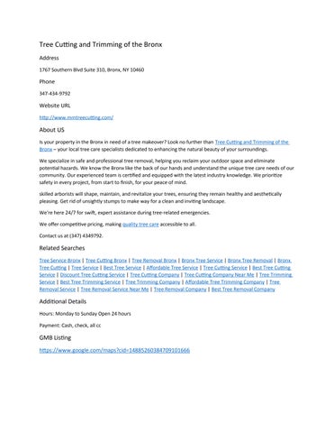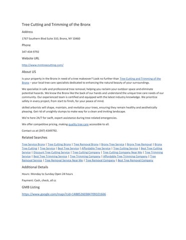 Phone: 347-434-9792 About us Is your property in the Bronx in need of a tree makeover? Look no further than Tree Cutting and Trimming of the Bronx – your local tree care specialists dedicated to enhancing the natural beauty of your surroundings. We specialize in safe and professional tree removal, helping you reclaim your outdoor space and eliminate potential hazards. We know the Bronx like the back of our hands and understand the unique tree care needs of our community. Our experienced team is certified and equipped with the latest industry knowledge. We prioritize safety in every project, from start to finish, for your peace of mind. skilled arborists will shape, maintain, and revitalize your trees, ensuring they remain healthy and aesthetically pleasing. Get rid of unsightly stumps to make way for a clean and inviting landscape. We're here 24/7 for swift, expert assistance during tree-related emergencies. We offer competitive pricing, making quality tree care accessible to all. Contact us at (347) 4349792. Related Searches Tree Service Bronx | Tree Cutting Bronx | Tree Removal Bronx | Bronx Tree Service | Bronx Tree Removal | Bronx Tree Cutting | Tree Service | Best Tree Service | Affordable Tree Service | Tree Cutting Service | Best Tree Cutting Service | Discount Tree Cutting Service | Tree Cutting Company | Tree Cutting Company Near Me | Tree Trimming Service | Best Tree Trimming Service | Tree Trimming Company | Affordable Tree Trimming Company | Tree Removal Service | Tree Removal Service Near Me | Tree Removal Company | Best Tree Removal Company Hours: Monday to Sunday Open 24 hours GMB Listing: https://www.google.com/maps?cid=14885260384709101666