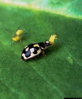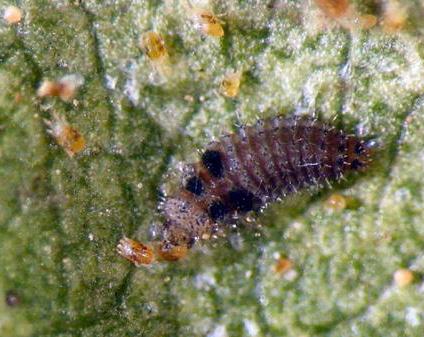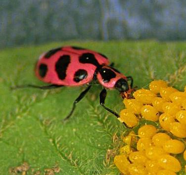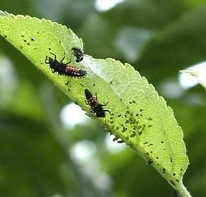 Species of the larger lady beetles feed on green apple and spirea aphids, certain other soft-bodied insects, and the eggs of moths and butterflies. Adults and early-instar larvae are not particularly heavy feeders, but late-instar larvae can be voracious, and by the end of its life, a single lady beetle will have consumed as many as 5,000 aphids.