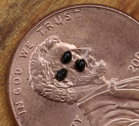 In addition, Stethorus punctum (the “spider mite destroyer” or “black lady beetle”) is a species native to North America that serves as an important and common predator of mites in apple orchards. Adults are similar in shape to “regular” lady beetles, but are much smaller with a diameter of approximately 1/16 inch (1.5mm). They are solid black and shiny, with a sparse covering of fine white hairs. Pupae are black and shaped like teardrops. Young S. punctum larvae are dark gray but become redder as they mature. Eggs are white, 1/64-inch (0.5mm) long, oval-shaped, and are usually laid on the undersides of leaves.
