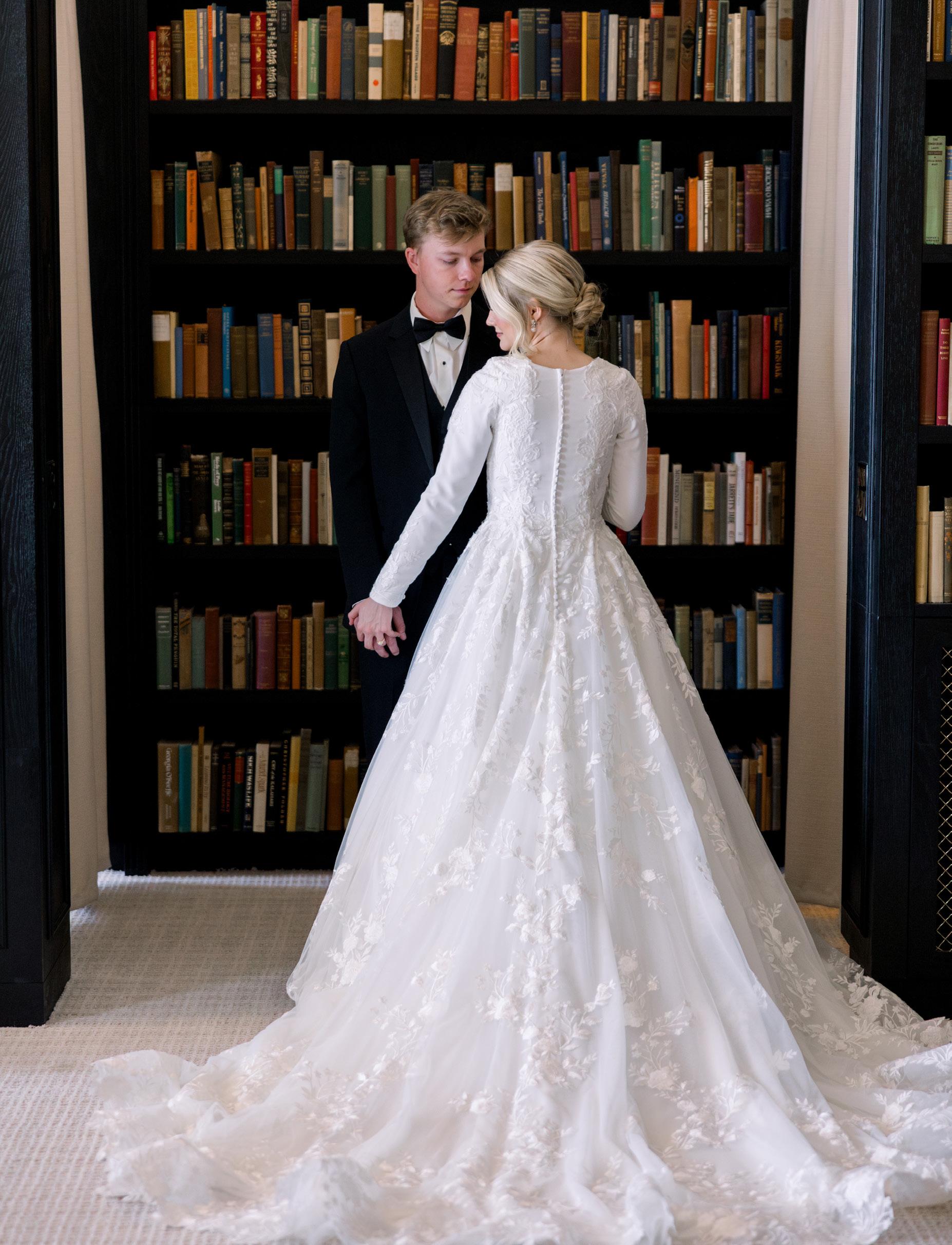 Lagniappe Bridal’s gown is a breathtaking off-the-shoulder design, exuding timeless elegance and romance. Crafted from intricate lace, the gown features delicate long sleeves made of sheer lace fabric that softly graces the bride’s arms, adding a touch of vintage sophistication. The bodice is fitted, highlighting the bride’s figure with exquisite floral lace detailing that continues throughout the full, voluminous skirt. The lace overlay creates a soft, textured look, while the flowing skirt adds a whimsical, ethereal quality. This gown is both classic and modern, perfect for a bride seeking a romantic and refined style for her big day. @lagniappebridal
