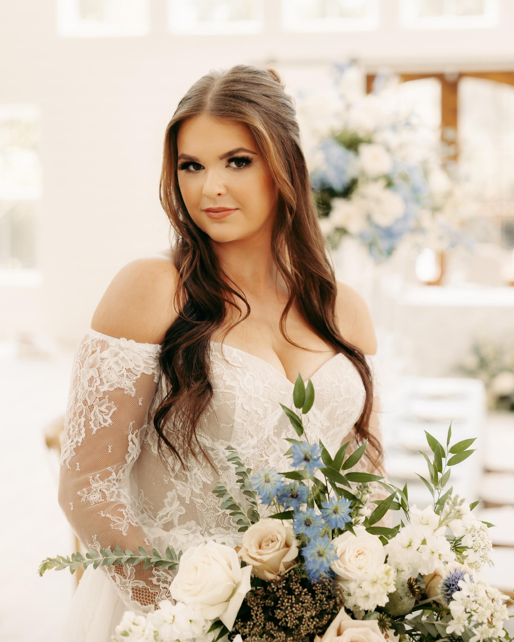 EmBeautyCo styled the bride in soft, voluminous waves that cascade down her back, with the top section gently pulled back adding a romantic and elegant touch. The bride’s makeup is glamorous yet subtle, enhancing her natural beauty. Her eyes are accentuated with bold eyeshadow, giving a soft smokeyeye effect. She has a flawless, dewy complexion with subtle contouring to highlight her cheekbones. Finished with a soft nude lip, complementing the soft glam theme. The overall style is classic and timeless, with a focus on natural beauty and elegance. @embeautyco__