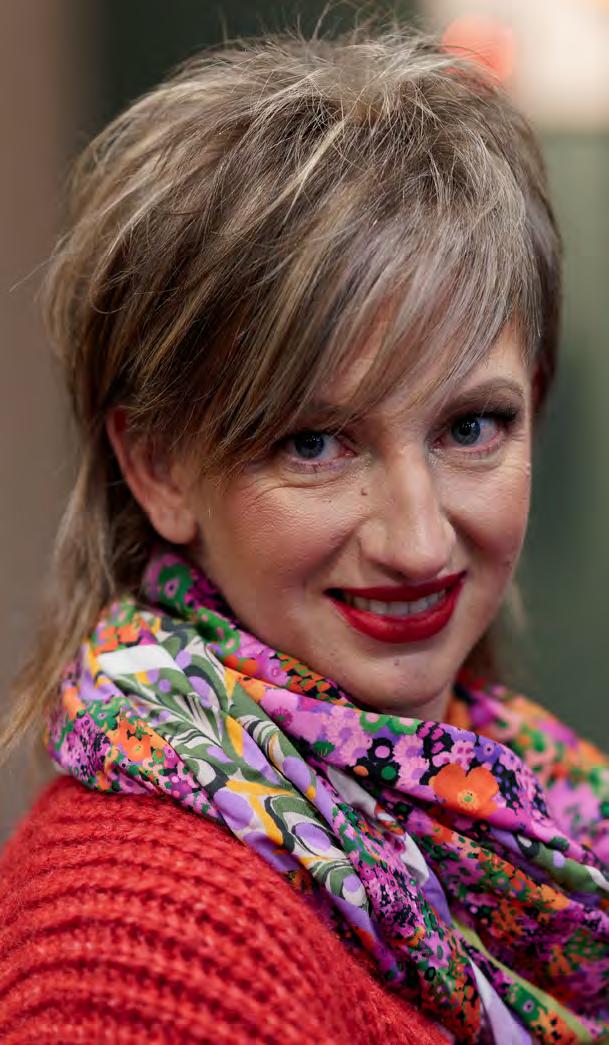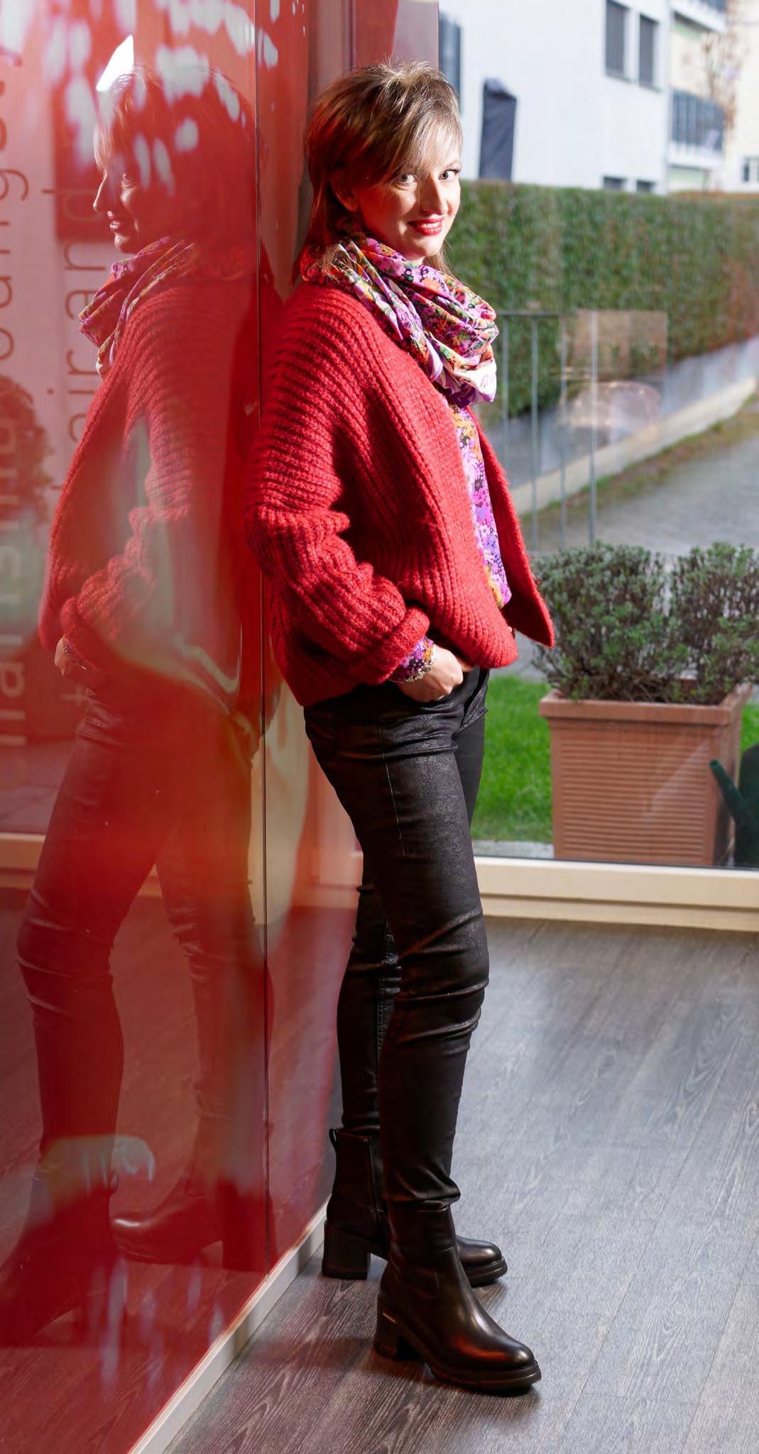 «Barbora ist eine spontane und auf den ersten Moment etwas zurückhaltende Frau, die jedoch weiss, was sie will», erklärt Andrea Delcò. Barboras starke Persönlichkeit hat die Stylingberaterin mit kräftigen, kalten Farben in Szene gesetzt. Zum schönen roten Cardigan, der bunten Bluse und dem dazugehörenden Foulard hat Andrea Delcò eine coole, etwas glänzende schwarze Hose kombiniert. Dazu passen die schwarzen Stiefeletten. Das Outfi t ist cool, bunt, modisch, bequem und für die Mama kindertauglich. «Auch eine Mutter mit kleinen Kindern darf sich unbedingt modisch zeigen», ist die Überzeugung der Stylingberaterin.