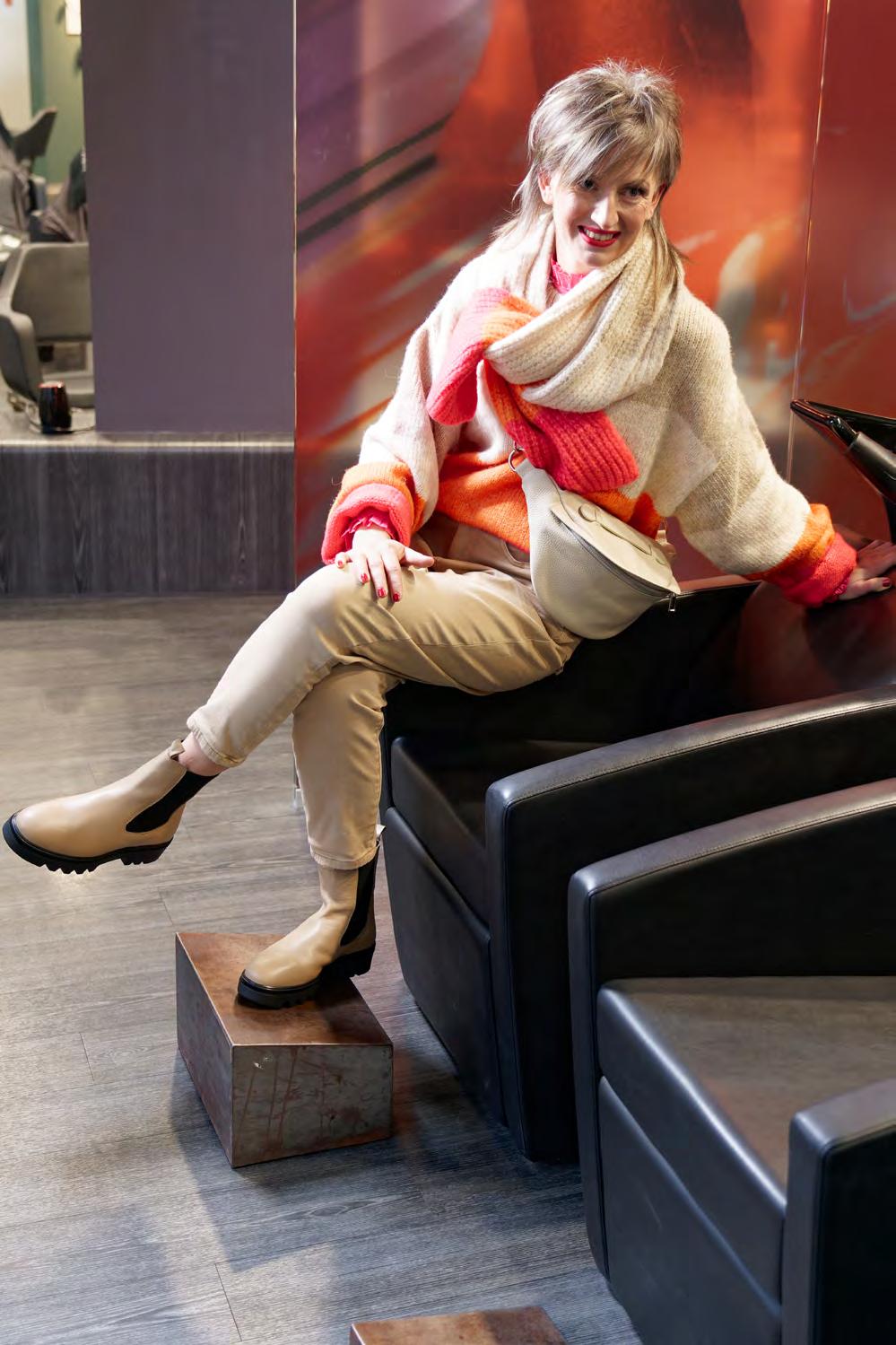 Das Outfi t auf der rechten Seit ist ebenfalls im sportlichen Stil gehalten, aber da alles Ton-in-Ton kombiniert wurde, ist es auch chic und topmodisch. Die pinke Bluse mit Stehkragen, die Barbora unter dem Pullover trägt, nimmt die kräftigen Farben von Pullover und Schal wieder auf. «Barbora hat eine schöne Model-Figur und kann somit Oufi ts in allen Varianten und Formen tragen und es wirkt immer cool», so Andrea Delcò. Auch die Accessoires, wie die hellen Stiefeletten und die beige Bauchtasche, runden das ganze Outfi t harmonisch ab.