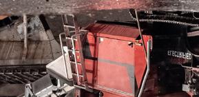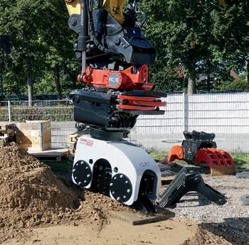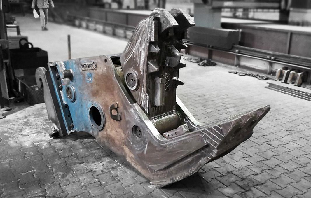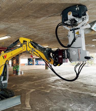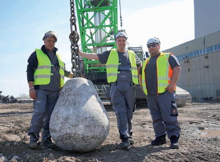 Traglast von bis zu 300 t auf – und diese kommen nun beim Abheben der Stahlbauteile im wahrsten Sinne des Wortes zum Tragen. Denn ausgestattet mit dem speziell für schwere Hübe ausgerichteten Krankopf, hebt der Abbruchgigant bei rund 91 m Auslegerlänge noch 50 t schwere Stahlträger ab. Für Sortierarbeiten sowie Rückbauarbeiten im Inneren setzt Ferraro auch auf den Abbruchbagger Sennebogen 830 Demolition. Dieser kompakte Abbruchbagger, der auf den selektiven Rückbau spezialisiert ist, sortiert den Bauschutt, zerkleinert den Betonbruch und extrahiert den Bewehrungsstahl.