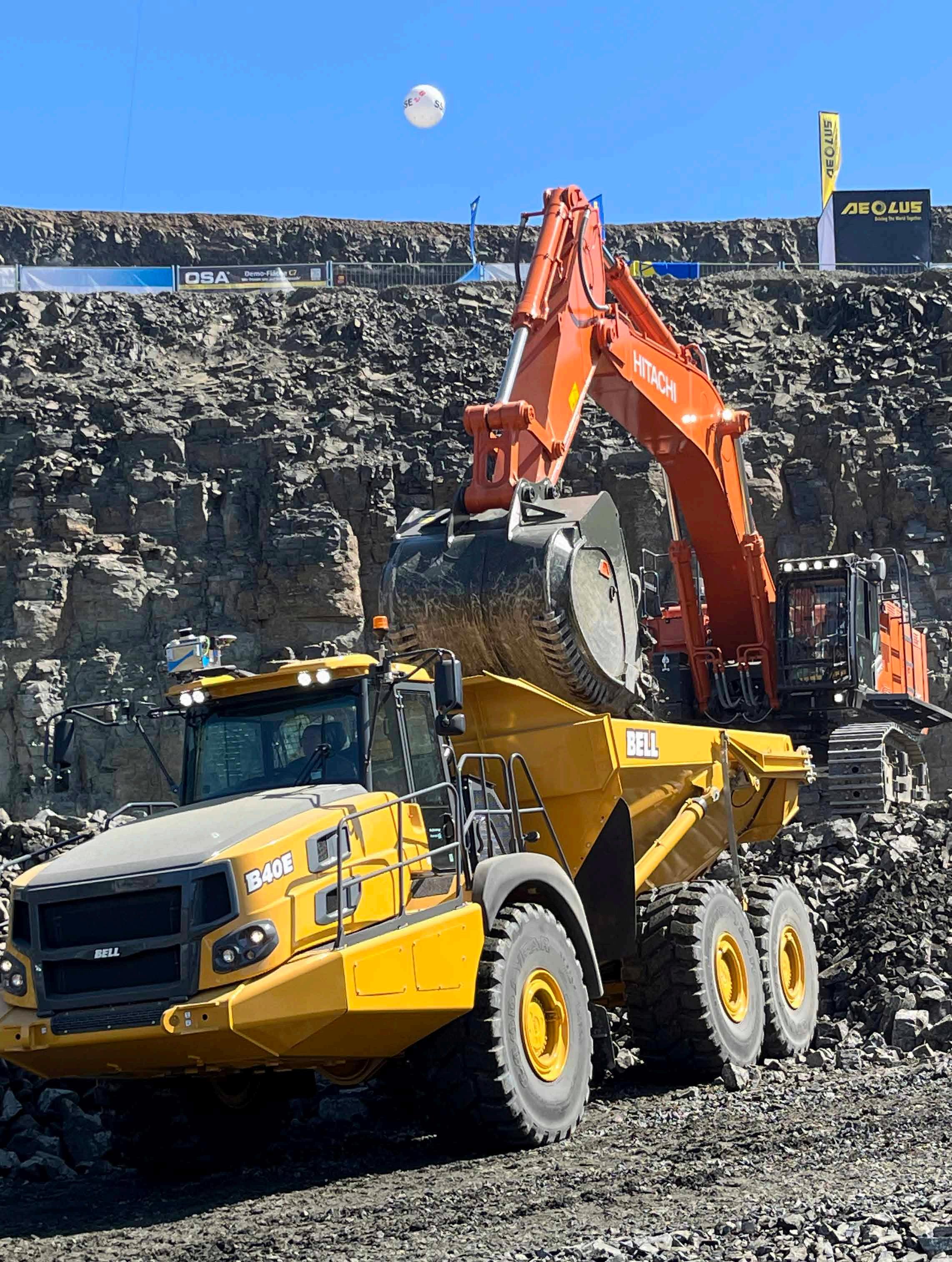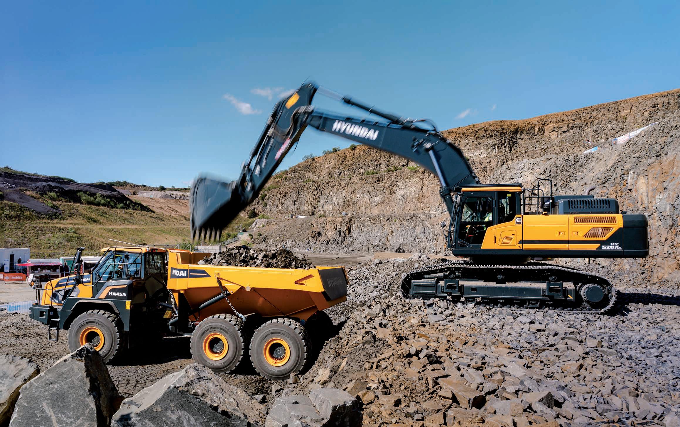 Hyundai füllt die Lücken im Baumaschinenprogramm. Die bauma 2022-Neuheiten HA30A und HA45A wollen sich unter anderem durch eine schwerpunktgünstige Muldenform von anderen Dumpern abgrenzen. Hier im Zusammenspiel mit dem Kettenbagger HX520A L auf der Steinexpo.