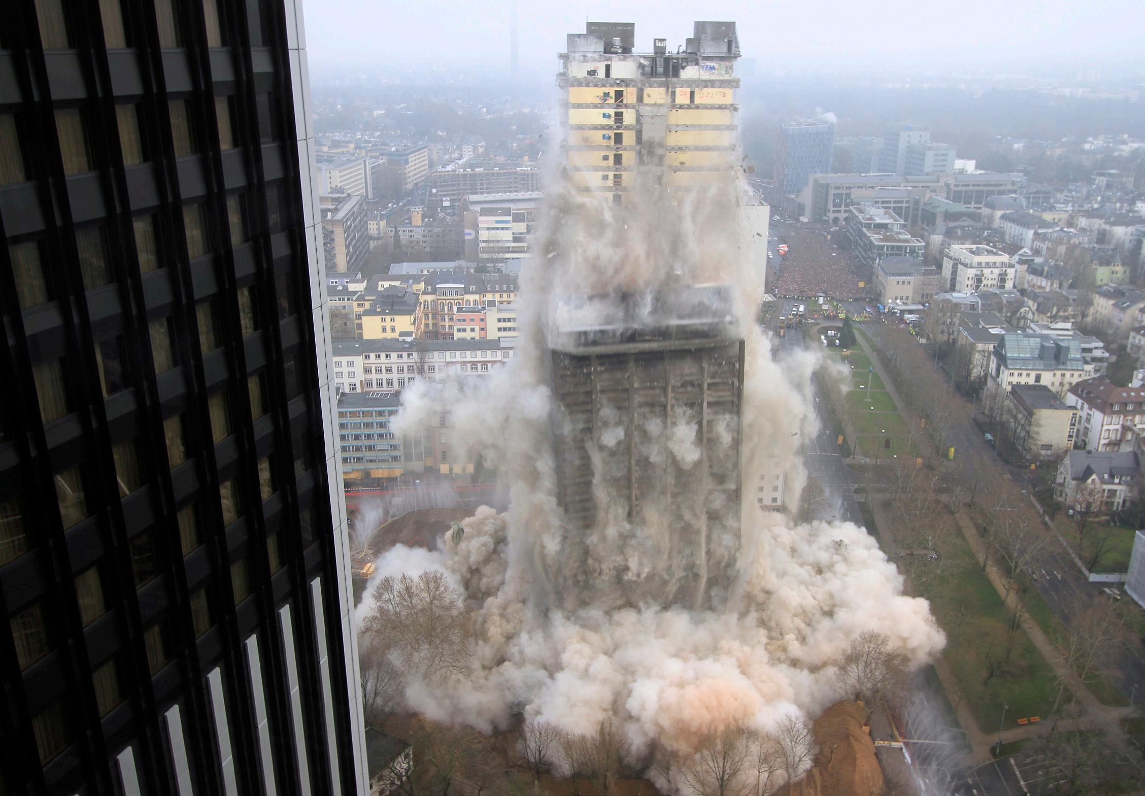 arbeitet mit 10-t-Abrissbirne in 75 m Höhe