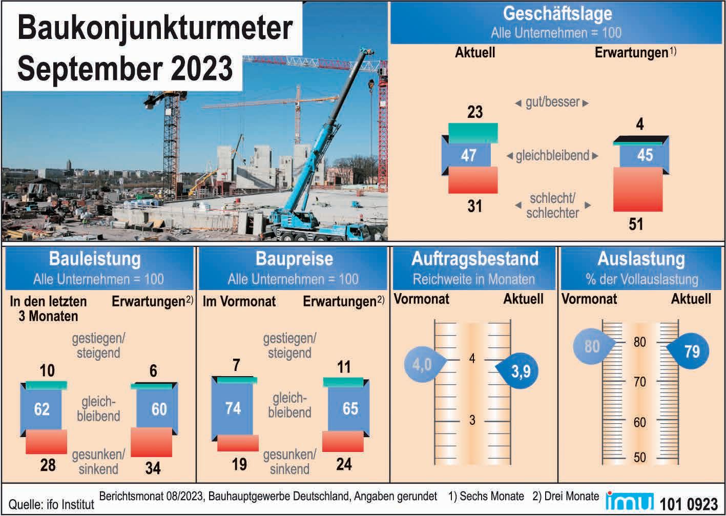 Bezüglich der Geschäftslage in den nächsten sechs Monaten rechnen rund 51 Prozent der Firmen mit einer weiteren Verschlechterung. Die Bautätigkeit hat nachgelassen und die Aussichten für die kommenden drei Monate haben sich weiter eingetrübt.