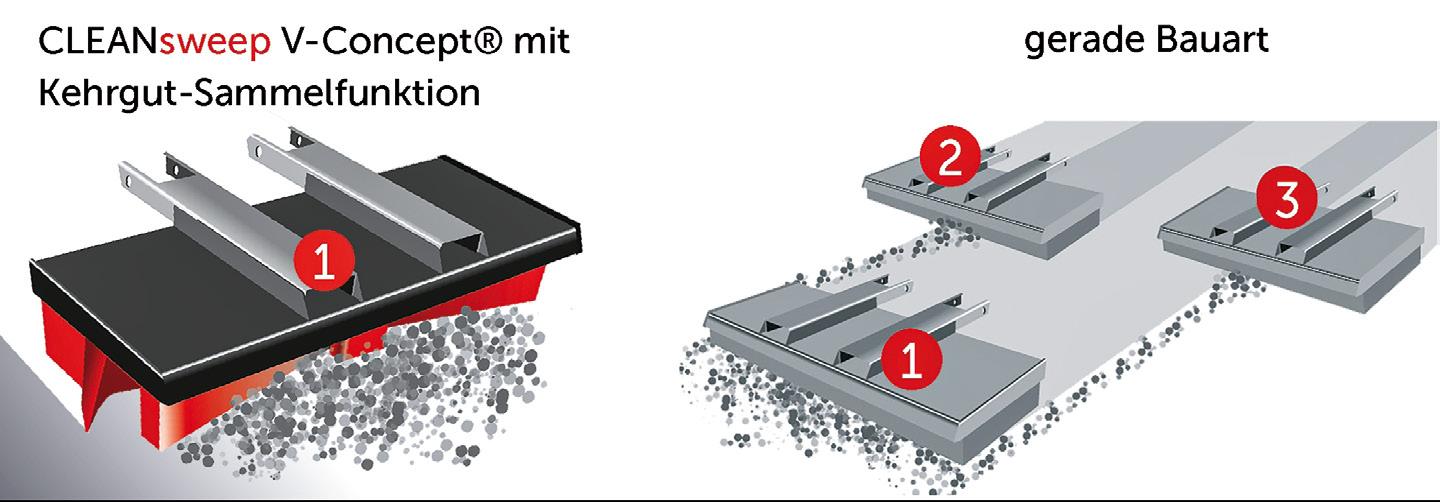 Durch die innovative Kehrgut-Sammelfunktion des V-Concept® können größere Kehrmengen bewegt werden. Das seitliche Weglaufen des Kehrguts wird verhindert. Nur 1 anstelle von 3 Kehrstrichen nötig.