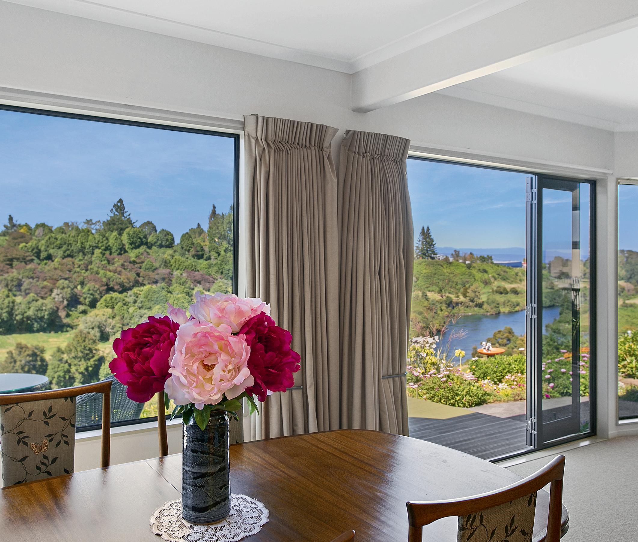 The perfect lock and leave or home sweet home. A fabulous home in an enviable location. This beautiful, well presented home is picture perfect with a large lounge/dining enjoying spectacular, almost 180-degree views of the Waikato River and bush and mountains beyond. Soak up the serenity or take a short, 15 minute walk into town to enjoy Taupo's beautiful bespoke shops. An extension to the lounge brings the views closer, with large wrap-around windows and doors flowing to the outdoor patio and gardens. Three bedrooms include a master with en-suite. The ground floor includes an office and direct access to a double garage. You will stay plenty warm enough on cooler days with gas heating. Off-street parking includes room for a boat or camper.