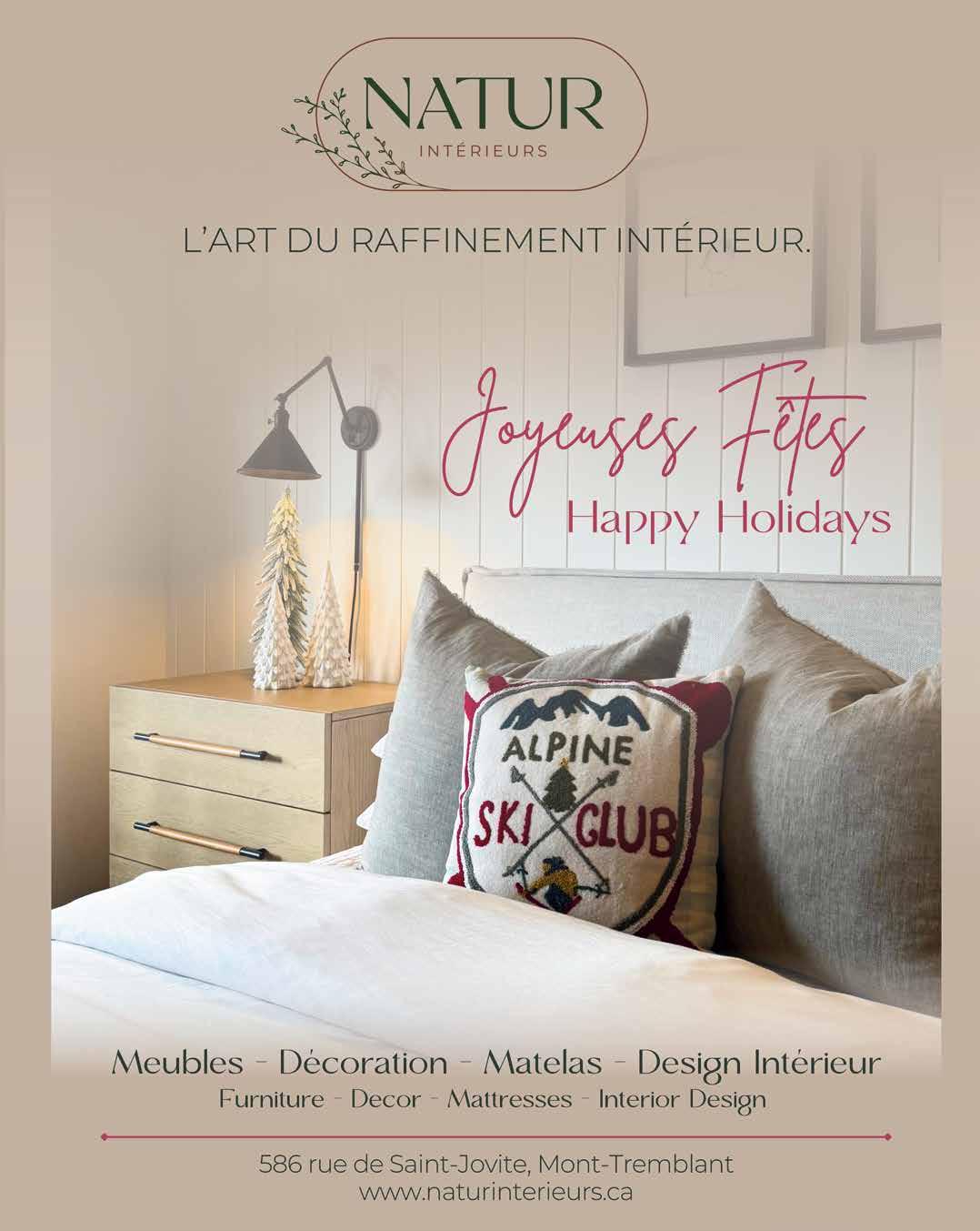 Our December cover bursts with the playful spirit of winter through a brand-new oil painting by internationally acclaimed Morin-Heights artist Pauline Paquin. Her signature world of a storybook childhood comes alive as joyful young skiers sweep down a snowy hillside, set against a luminous winter backdrop. See this vibrant piece in the front window of Galerie d’Art Béliveau on rue de Saint-Jovite in Mont-Tremblant.