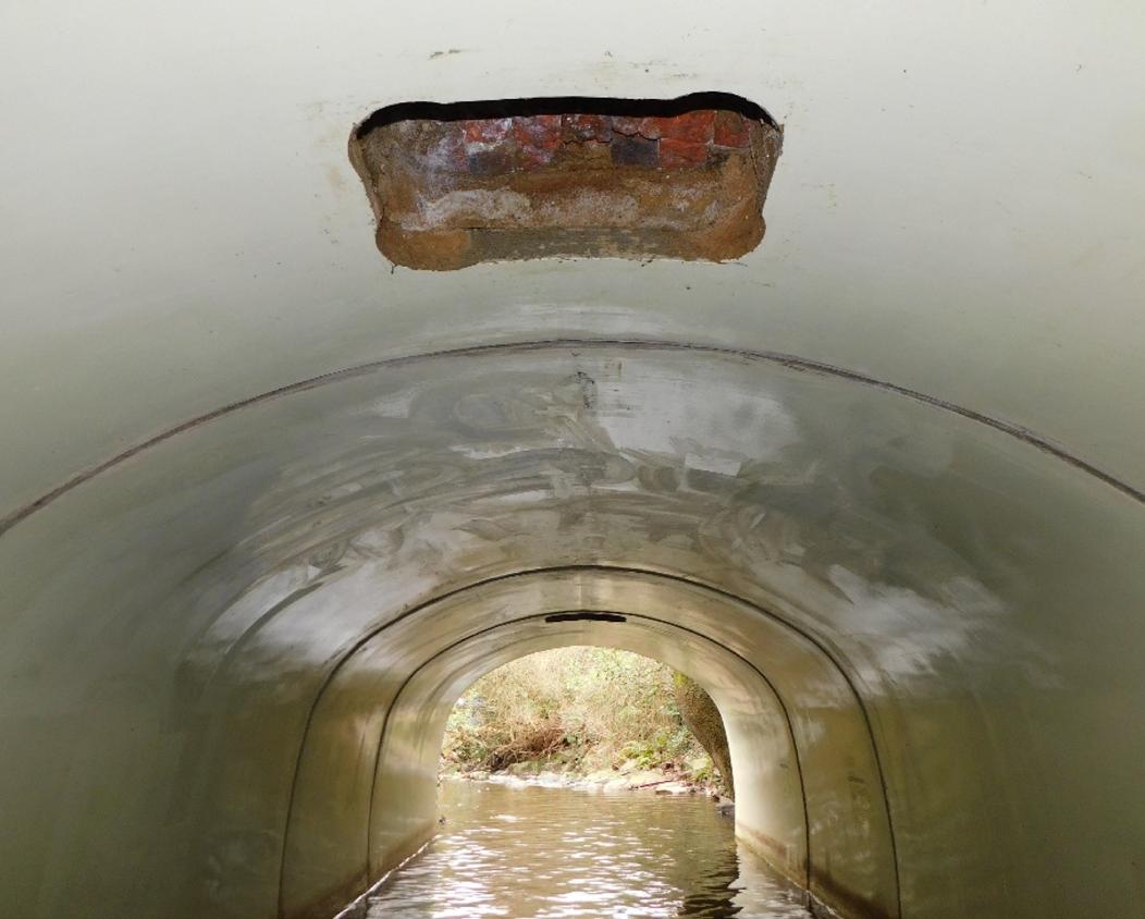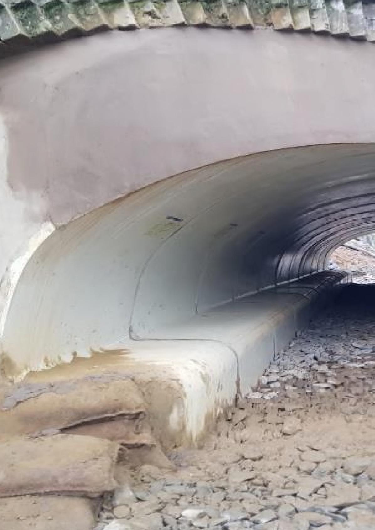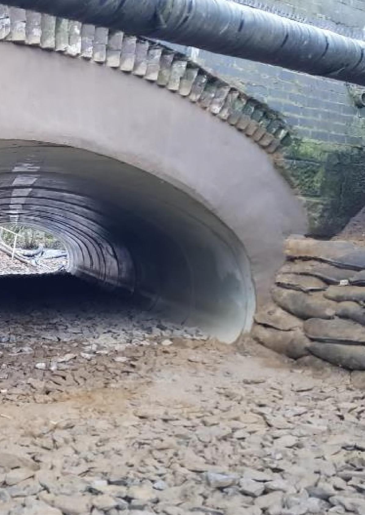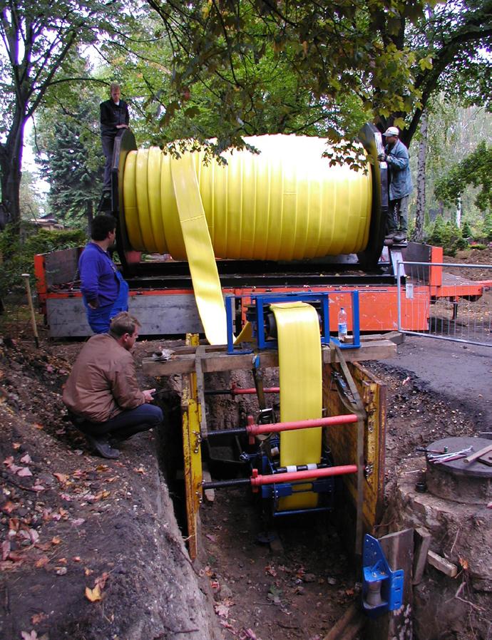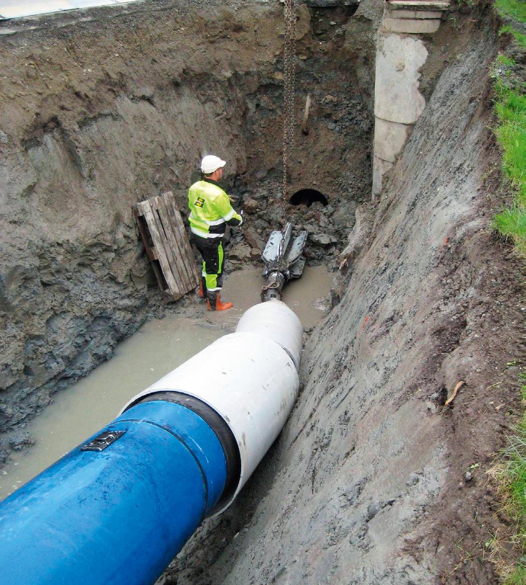 During the installation, the factoryimpregnated glass fibre sleeve, which was shielded both inside and outside by tubular thermoplastic foils, was inverted using air. The light trolley (yes, only one trolley)