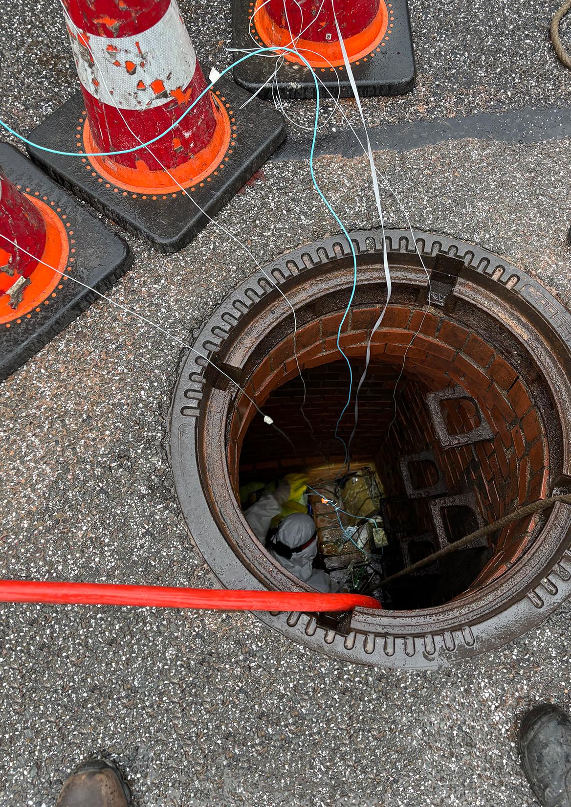 The installation utilised a coneshaped tool anchored at the inversion side manhole with a “rubber packer.” Remarkably, the rubber packer was placed inside the liner itself, leaving the first 20-30 cm uncured. This required separate curing after the light train completed its work. The liner was then pushed through the cone and secured with a leather membrane tightened by a rubber band to prevent any internal pressure from