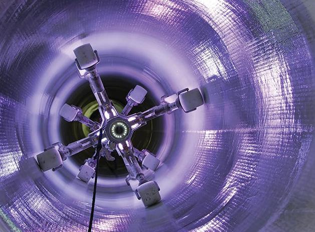 Insituform’s UV-curing patent was subsequently granted across Europe; however, their design placed the light source underwater. At Inpipe, we did not consider this configuration competitively viable at the time due to the inherent challenges of operating a highvoltage light source in a waterfilled pipeline. Furthermore, water absorbs a notable share of UV radiation, significantly reducing
