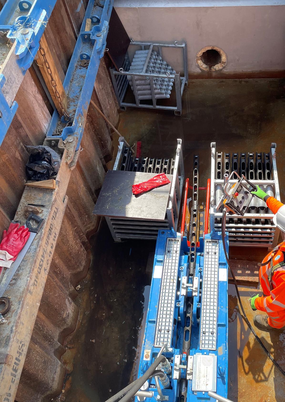 This technology necessitated the presence of a technician in the manhole throughout the entire inversion process, which could last for several hours. Keeping the liner and the inner tubing lubricated with talcum powder was essential for smooth operation. Soon after the initial installation, the original tool was upgraded: the “invrängnings dorn” was replaced by a 90-degree elbow, allowing for top-fed lining while maintaining the secure locking mechanism.