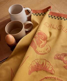 Geen volk dat de Franse keuken beter weet te waarderen dan de Britten. Het is dan ook een Brits merk, Home Landing, dat een collectie theedoeken op de markt heeft gebracht met typisch Franse gastronomische motieven en dat die momenteel uitbreidt. Het nieuwste model ‘Culinairy Charm’ is een prachtige jacquard theedoek met de naam ‘Croissant Galore’, een naam met een knipoog. Andere hebben kippen (Poulet) en een Pot-au-feu in hun naam en decors. Een serie die klassiek en chique met elkaar verbindt.