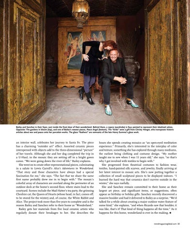 hours she spends creating mosaics as “an open-eyed meditation experience.” Primarily, she’s interested in the interplay of color and texture, something she has explored through many mediums, the earliest being clothing and costume design. “My mother taught me to sew when I was 11 years old,” she says, “so that’s why I got involved with textiles to begin with.” She progressed from theatrical costumes to fashion wear, textiles, hand-painted silk scarves, and jewelry, finally arriving at her latest interest in mosaic arts. She’s now putting together a collection of small sculptural pieces to be displayed indoors. “I learned the hard way that ceramics don’t survive outside in the winter,” she says ruefully. She and Sanchez remain committed to their home as their largest art piece, and significant items, or suggestions, often appear as birthday or holiday gifts. Sanchez recently discovered a massive boulder and had it delivered to Bailey as a surprise. “We’d talked for a while about creating a major outdoor water feature of some kind,” she explains, “and when Ricardo saw that boulder, it was like, that’s it! That kind of thing happens all the time.” As it happens for this home, wonderland is ever in the making. R