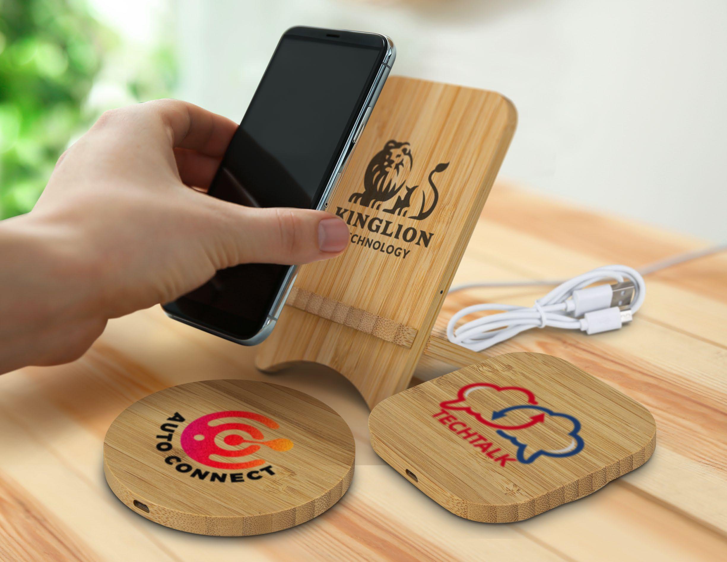 Wireless 5W phone charger with a sleek natural bamboo finish. It will charge devices that are enabled for wireless charging and will work with most modern phones. Simply plug it into any USB port or a mains adapter and place a compatible device on it for convenient wireless charging. The charger is presented in a kraft gift box with a Micro-B USB cable and an instruction leaflet. Bamboo is a natural material that produces unavoidable variances in the grain pattern, colour and branding. Please note that some phone cases may affect the wireless charging connection.