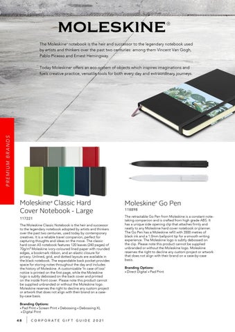117221 The Moleskine Classic Notebook is the heir and successor to the legendary notebook adopted by artists and thinkers over the past two centuries, used today by contemporary creatives. It is a reliable travel companion, perfect for capturing thoughts and ideas on the move. The classic hard cover A5 notebook features 120 leaves (240 pages) of 70g/m² Moleskine ivory-coloured lined paper with rounded edges, a bookmark ribbon, and an elastic closure for privacy. Unlined, grid, and dotted layouts are available in the black notebook. The expandable back pocket provides space for storing notes throughout the day and includes the history of Moleskine. A customizable ‘In case of loss‘ notice is printed on the first page, while the Moleskine logo is subtly debossed on the back cover and printed on the inside front cover. Please note this product cannot be supplied unbranded or without the Moleskine logo. Moleskine reserves the right to decline any custom project or artwork that does not align with their brand on a caseby-case basis. Branding Options: • Pad Print • Screen Print • Debossing • Debossing XL • Digital Print 48