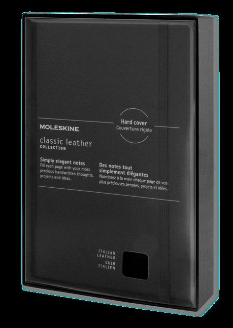 The Classic Leather Notebook is designed to enfold precious handwritten notes in premium Italian leather. This luxury notebook contains 88 leaves (176 pages) of 100g/m² lined Moleskine ivory-coloured paper which is designed to support a wide range of professional and creative writing instruments. Other features include a customisable ‘In case of loss‘ notice printed on the first page, a matching bookmark ribbon, and an elastic closure for privacy. The Moleskine logo is subtly debossed on the back cover and printed on the inside front cover. A wonderfully refined space just waiting to be filled with your unique contents, the Classic Leather Notebook is presented in a neat box with a cut-out lid that allows you to experience the tactile, pebbled leather cover. Please note this product cannot be supplied unbranded or without the Moleskine logo. Moleskine reserves the right to decline any custom project or artwork that does not align with their brand on a caseby-case basis.