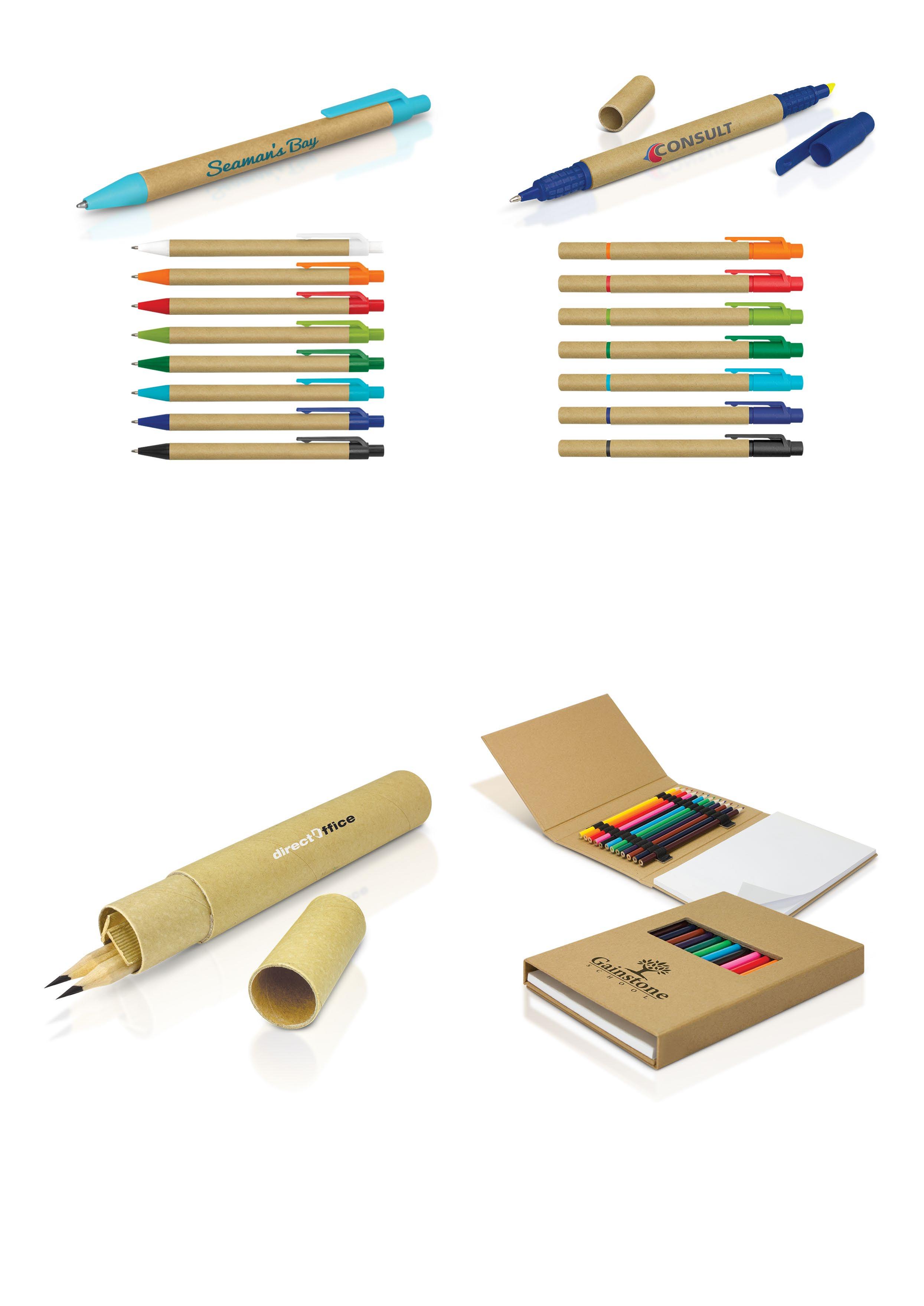 Branding Options: Eco Pen & Pencil Set 115888 Handy pen and pencil set in a natural unbleached cardboard tube. The set contains two unpainted wood HB pencils and two pens which are manufactured from natural unbleached paper. The pens both have black ink and push on caps. • Pad Print • Screen Print • Direct Digital