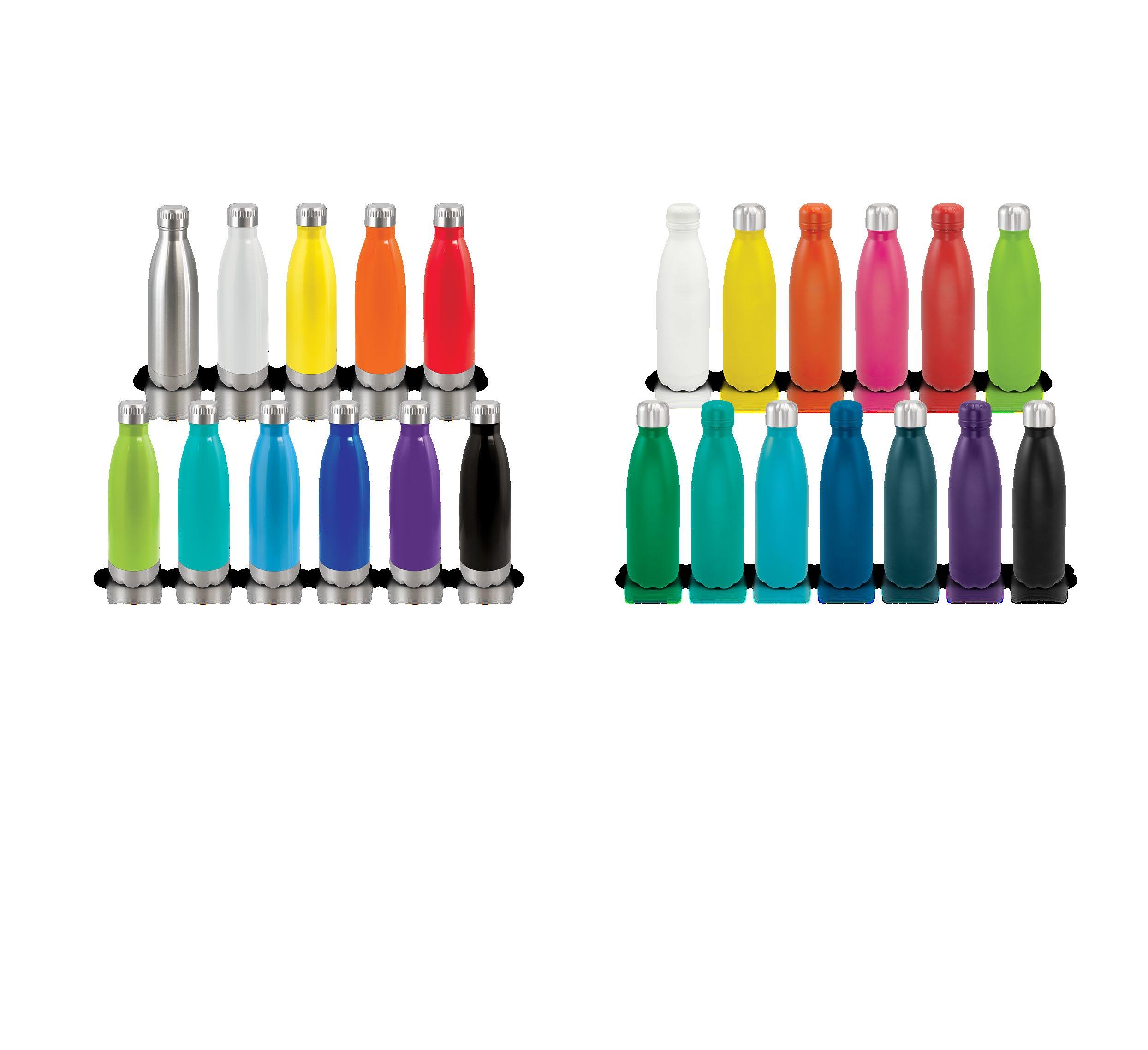 Trendy 500ml double wall, vacuum insulated stainless steel drink bottle with a stunning powder coated finish. It will keep drinks cold for 24 hours or hot for up to 12 hours. Mirage has a powder coated screw on lid as well as a classic stainless steel option. The bottle and lid can be mixed and matched in any colour combination from the standard colours. Up to five different colour combinations are included in the price and more are available for an additional charge. Mirage is BPA-free and laser engraves to a shiny steel finish. It is presented in a black gift box and an optional gift tube is available on request. This product is not dishwasher safe and handwashing is recommended.