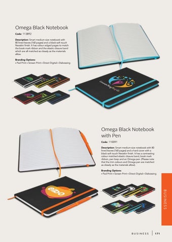 Omega Black Notebook Code: 113892 Description: Smart medium size notebook with 80 lined leaves (160 pages) and a black soft touch Neoskin finish. It has colour edged pages to match the book mark ribbon and the elastic closure band which are all matched as closely as the materials allow. Branding Options: • Pad Print • Screen Print • Direct Digital • Debossing