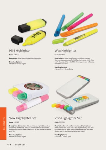 Description: A novel but effective highlighter that uses fluorescent coloured wax for highlighting instead of ink. Wax won’t dry up so it has a shelf life of many years and will always work when required.
