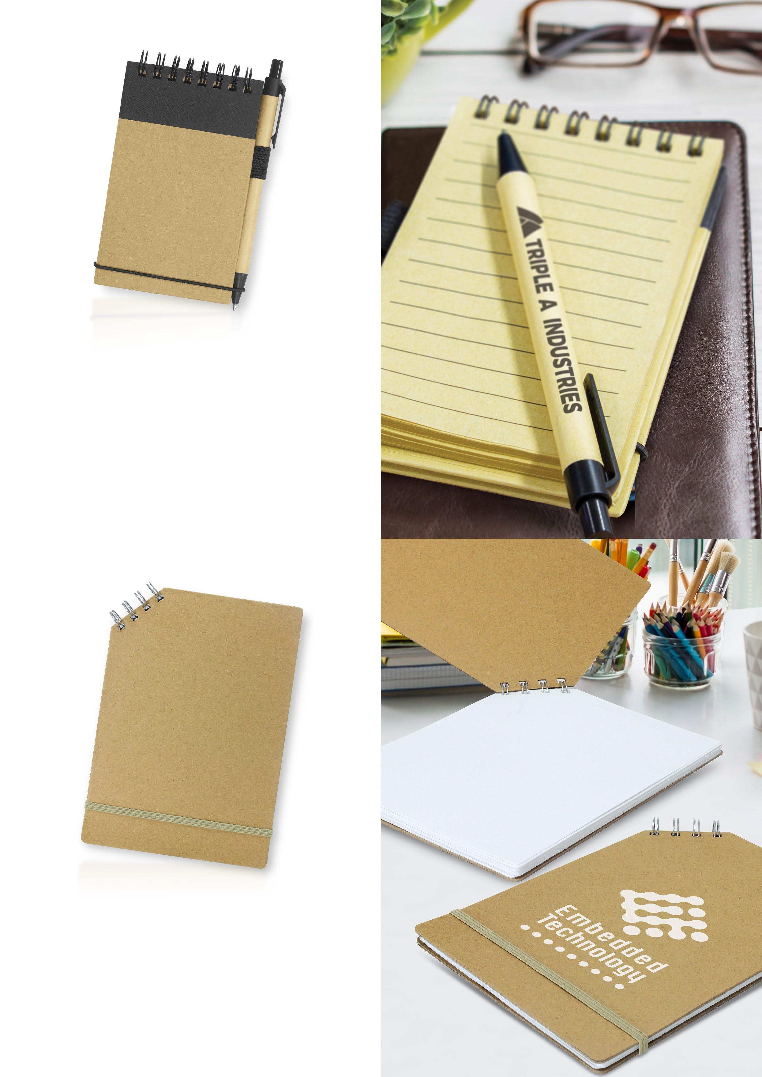 Eco-friendly, wiro bound note pad which is available in two sizes. They are manufactured from recycled paper and have 60 leaves of lined paper. The smaller pocketsize is bound at the top and the larger size is bound at the side.