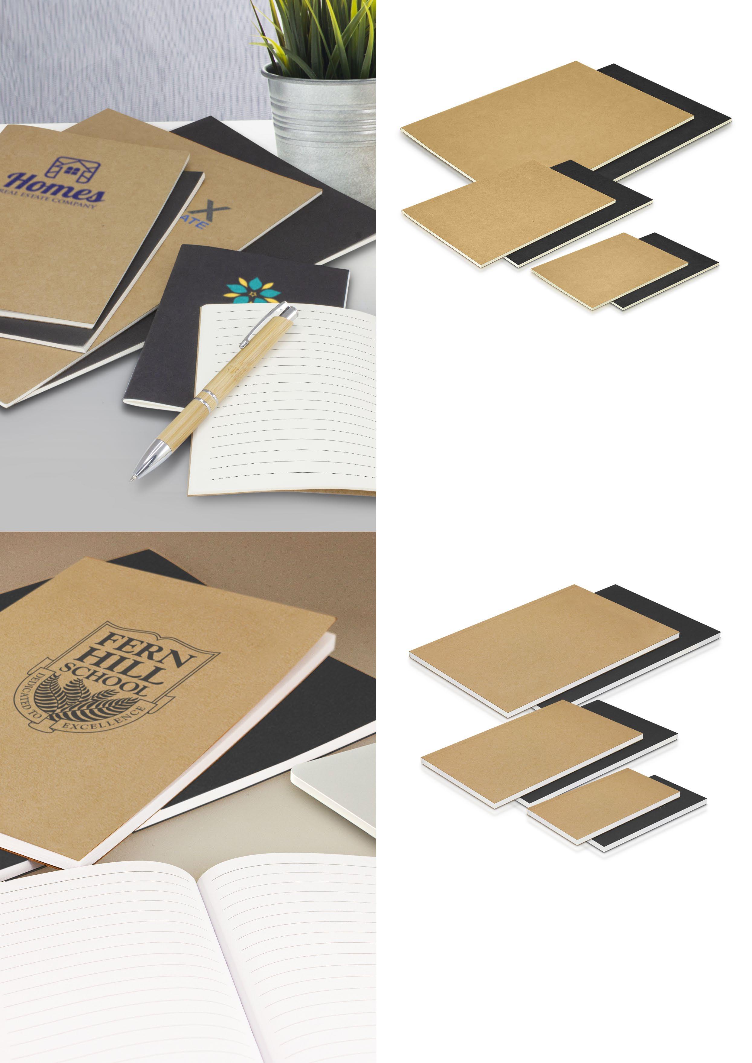 Perfect bound note pad in three handy sizes with 60 leaves (120 pages) of lined paper and a cardboard cover.