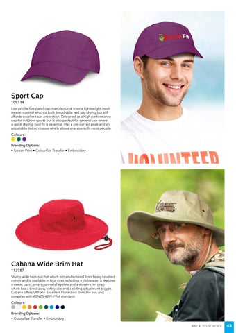 Sturdy wide brim sun hat which is manufactured from heavy brushed cotton and is available in four sizes including a childs size. It features a sweat band, smart gunmetal eyelets and a woven chin strap which has a breakaway safety clip and a sliding adjustment toggle. Cabana offers UPF50+ Excellent Protection from the sun and complies with ASNZS 4399-1996 standard. Colours: Branding Options: • Colourflex Transfer • Embroidery B ACK TO SCHO O L