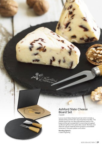Luxury round slate cheese board set which includes a cheese knife and fork with natural bamboo handles. The cheese board has non-slip polyurethane pads on the base and the set is presented in a stunning corrugated cardboard gift box that opens like a book. Bamboo and slate are natural materials which produce unavoidable variances in the grain pattern and colour. Branding Options: • Laser Engraving