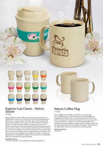Classic 350ml reusable coffee cup which is manufactured from a 50/50 blend of natural rice husk fibre and BPA-free polypropylene. Rice husk is a waste product with little value and the agricultural industry often dispose of it by burning which creates air pollution. Using it to make a reusable coffee cup reduces the amount of plastic and produces a trendy natural look. Other features include a secure screw on lid and a heat-resistant silicone band. The band can be mixed and matched in any colour combination from the standard colours. Up to five different colour combinations are included in the price and more are available for an additional charge. An optional black gift box is available on request. This product is not dishwasher safe and handwashing is recommended.