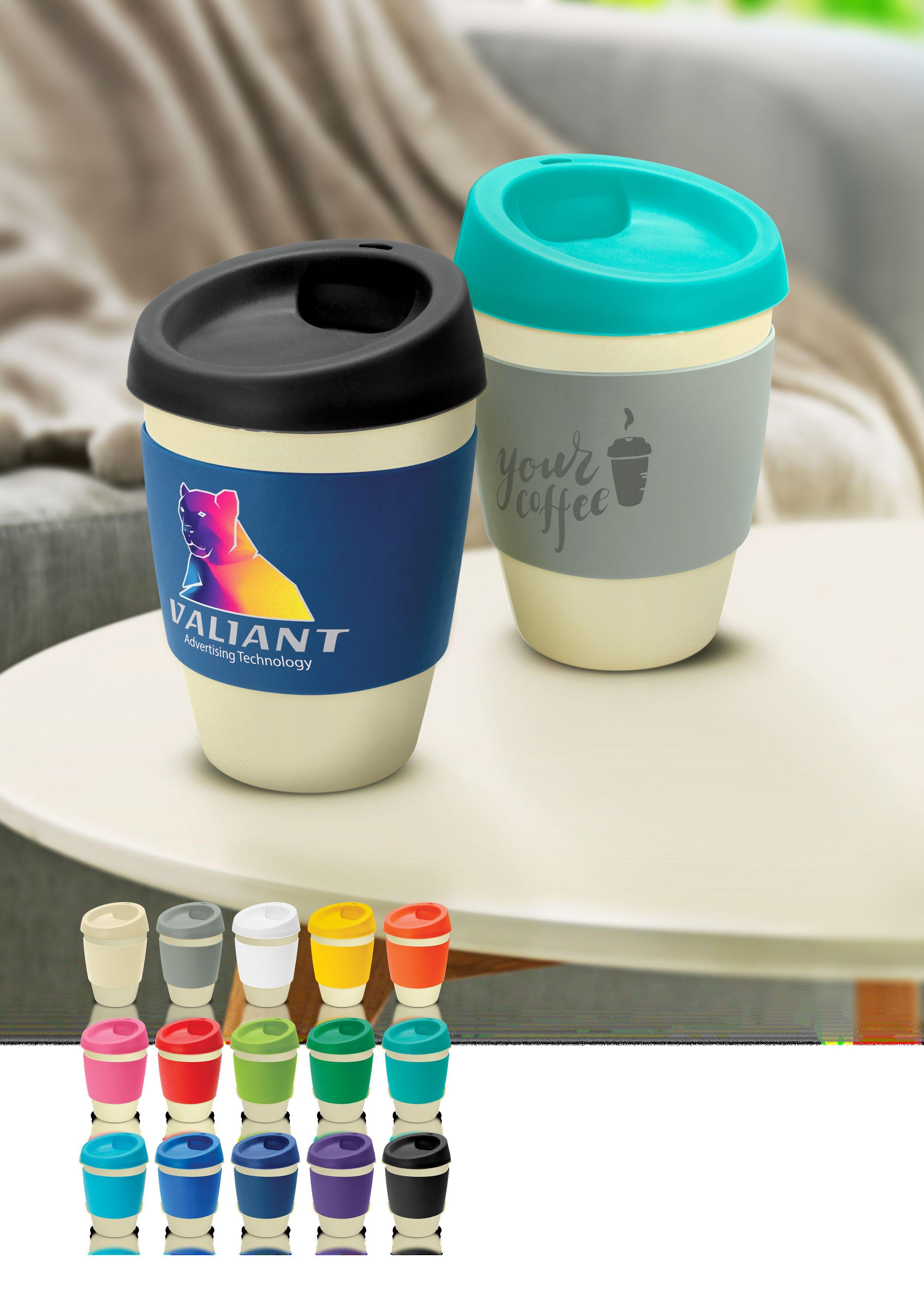 Eco inspired 340ml reusable coffee cup which is manufactured from a unique 50/50 blend of bamboo and BPA-free melamine. Using bamboo to manufacture a reusable coffee cup reduces the amount of plastic and produces a trendy natural look. Metro has a secure push on silicone lid and a wide heat resistant silicone band. The lid and band can be mixed and matched in any colour combination from the standard colours at no extra cost. Up to five different colour combinations are included in the price and more are available for an additional charge. An optional gift box is available on request. This product is not dishwasher safe and handwashing is recommended. Branding Options: • Pad Print • Screen Print • Debossed • Silicone Digital Print