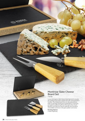 Luxury rectangular slate cheese board set which includes two cheese knives and a cheese fork with natural bamboo handles. The cheese board has non-slip polyurethane pads on the base and the set is presented in a stunning corrugated cardboard gift box that opens like a book. Bamboo and slate are natural materials which produce unavoidable variances in the grain pattern and colour. Branding Options: • Laser Engraving