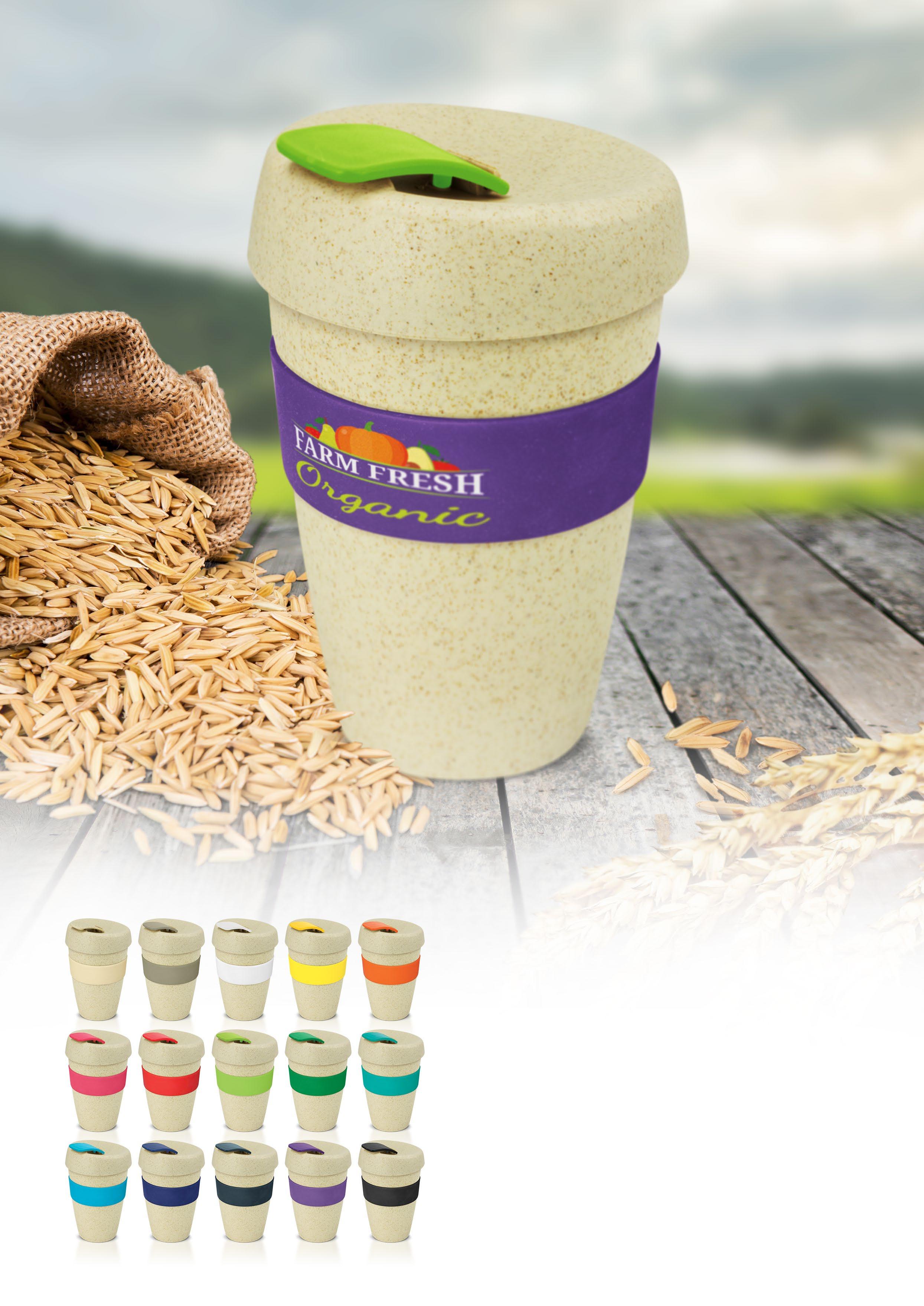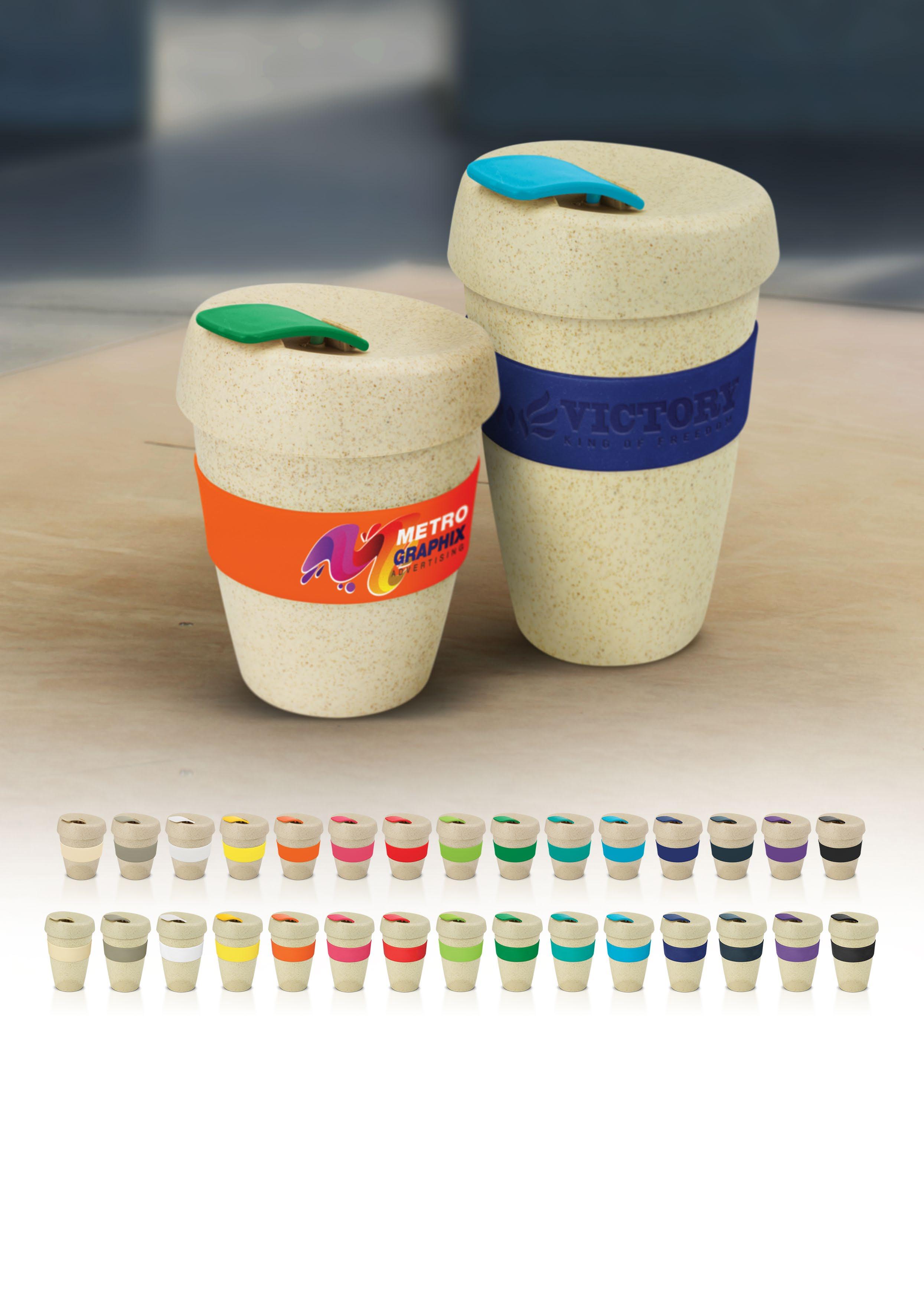 Classic 350ml reusable coffee cup which is manufactured from a 50/50 blend of natural rice husk fibre and BPA-free polypropylene. Rice husk is a waste product with little value and the agricultural industry often dispose of it by burning which creates air pollution. Using it to make a reusable coffee cup reduces the amount of plastic and produces a trendy natural look. Other features include a secure screw on lid and a heat-resistant silicone band. The band can be mixed and matched in any colour combination from the standard colours. Up to five different colour combinations are included in the price and more are available for an additional charge. An optional black gift box is available on request. This product is not dishwasher safe and handwashing is recommended. Branding Options: • Pad Print • Screen Print • Debossed • Silicone Digital Print
