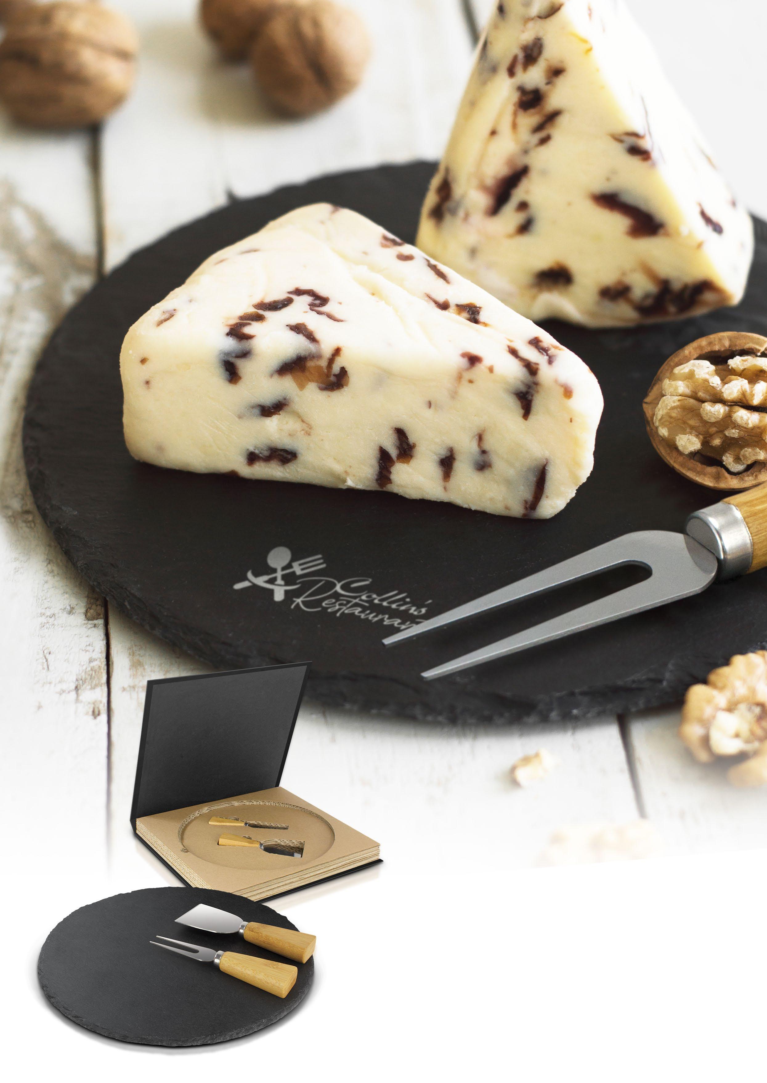 Luxury round slate cheese board set which includes a cheese knife and fork with natural bamboo handles. The cheese board has non-slip polyurethane pads on the base and the set is presented in a stunning corrugated cardboard gift box that opens like a book. Bamboo and slate are natural materials which produce unavoidable variances in the grain pattern and colour. Branding Options: • Laser Engraving