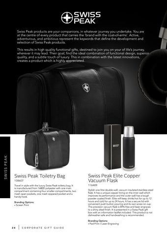 Stylish one litre double wall, vacuum insulated stainless steel flask. It has a unique copper lining on the inner wall which improves its performance and the outer wall has a tough powder coated finish. Elite will keep drinks hot for up to 12 hours and cold for up to 24 hours. It has a secure lid with convenient push button pouring and its own screw on cup. This precision vacuum flask is BPA-free and laser engraves to a shiny steel finish. It is presented in a Swiss Peak gift box with an information leaflet included. This product is not dishwasher safe and handwashing is recommended. Branding Options: • Pad Print • Laser Engraving