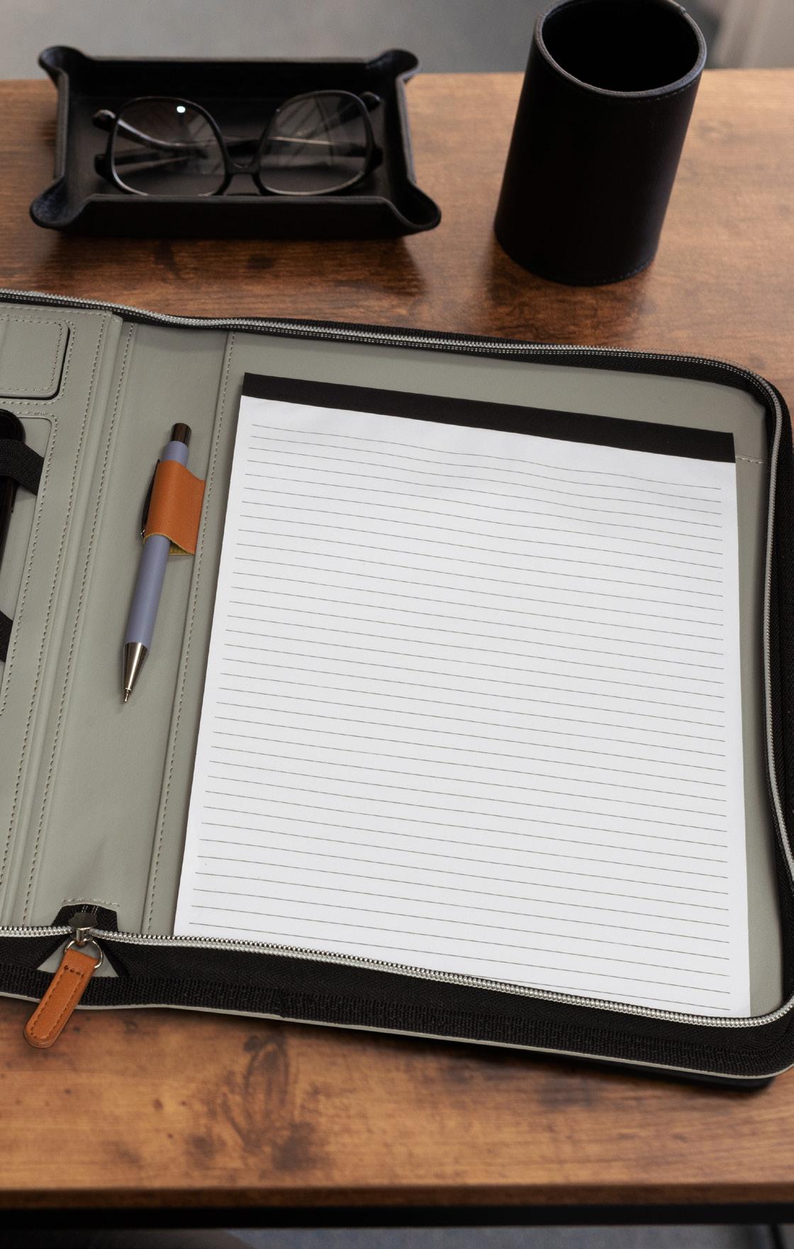 • PU portfolio with tan strip and zippered closure