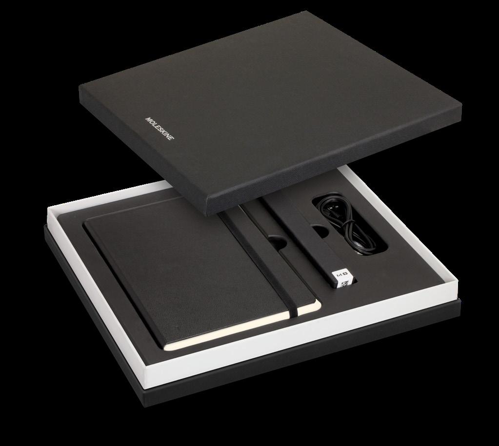 The Moleskine Smart Writing Set is an instant-access kit that unlocks creativity and allows the user to digitally edit and share notes and thoughts that begin life naturally on paper. Simply install the Moleskine Notes App on any suitable device, turn the Smart Pen on and start writing. The set includes a Paper Tablet Smart Notebook with 88 leaves (176 pages) of specially designed 100g/m² ²paper, a Moleskine Smart Pen which will transfer written content directly to a smartphone, tablet or computer, a Smart Pen refill, a Micro-B USB charging cable and an instruction leaflet. A customisable ‘In case of loss‘ notice is printed on the first page of the notebook and it has an expandable back storage pocket which includes the history of Moleskine. The Moleskine logo is subtly debossed on the pen clip and the back of the notebook. It is also tastefully printed on the barrel of the pen and the inside cover of the notebook. This technology-driven writing system is the perfect corporate gift and is beautifully presented in a Moleskine branded gift box. Please note this product cannot be supplied unbranded or without the Moleskine logo. Moleskine reserves the right to decline any custom project or artwork that does not align with their brand on a case-by-case basis.