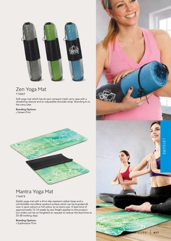 Stylish yoga mat with a 2mm slip-resistant rubber base and a comfortable microfibre workout surface which can be branded all over in spot colours or full colour at no extra cost. A lead time of approximately 12–14 weeks by sea freight applies to this product but orders can be air freighted on request to reduce the lead time to 25–30 working days. Branding Options: • Sublimation Print