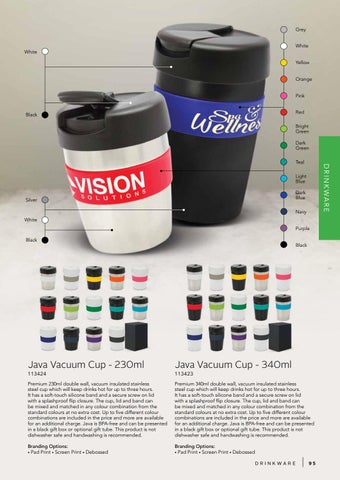 Premium 340ml double wall, vacuum insulated stainless steel cup which will keep drinks hot for up to three hours. It has a soft-touch silicone band and a secure screw on lid with a splashproof flip closure. The cup, lid and band can be mixed and matched in any colour combination from the standard colours at no extra cost. Up to five different colour combinations are included in the price and more are available for an additional charge. Java is BPA-free and can be presented in a black gift box or optional gift tube. This product is not dishwasher safe and handwashing is recommended.